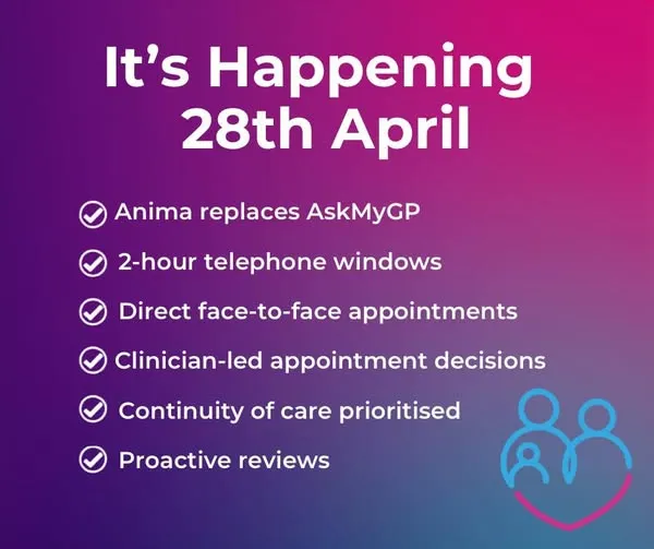 We are a GP surgery providing NHS services to our patients. We use Ask My GP which means patients can send their requests to the surgery electronically and be seen by their usual GP on the same day in most cases.